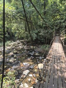 In Kao Sok reihten sich Hotels, Restaurants und Minibusse an der Hauptstaße, an deren Ende der Natonalpark beginnt. Auf dem Wanderpfad zu den Wasserfällen überholte ich immer wieder Gruppen mit lauten Guides, um die Natur genießen zu können. Außer Makaken-Affen, die auf Futter hofften, waren sicher alle Tiere geflohen. Im Fluss konnte ich mich köstlich erfrischen. Nach dem dritten Wasserfall befand sich auf dem Weg eine verschlossene Tür, die nur mit Guide zu öffnen war. Ich wanderte zurück und fand am Eingang einen Weg, der über unendlich viele Treppen durch den Dschungel führte. Das war sicher der Grund, warum hier niemand außer mir unterwegs war.