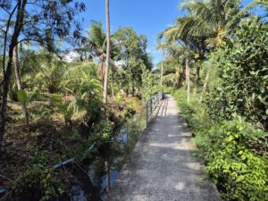 Am Pier von Bang Krachao erwartete uns ein riesiges Angebot von Leihfahhrädern, ich schnappte mir eins und fuhr auf´s gratewohl los. Von einem früheren Besuch erinnerte ich mich an schmale Wege mit nur einem Geländer an einer Seite, jetzt war ich auf einer Straße mit Autoverkehr und verirrte mich erstmal, bevor ich die Pfade über dem Dschungel wiederfand. Konzentriertes Radfahren war lebensnotwendig, um nicht vom rechten Wege abzukommen und im Urwaldsumpf zu enden!